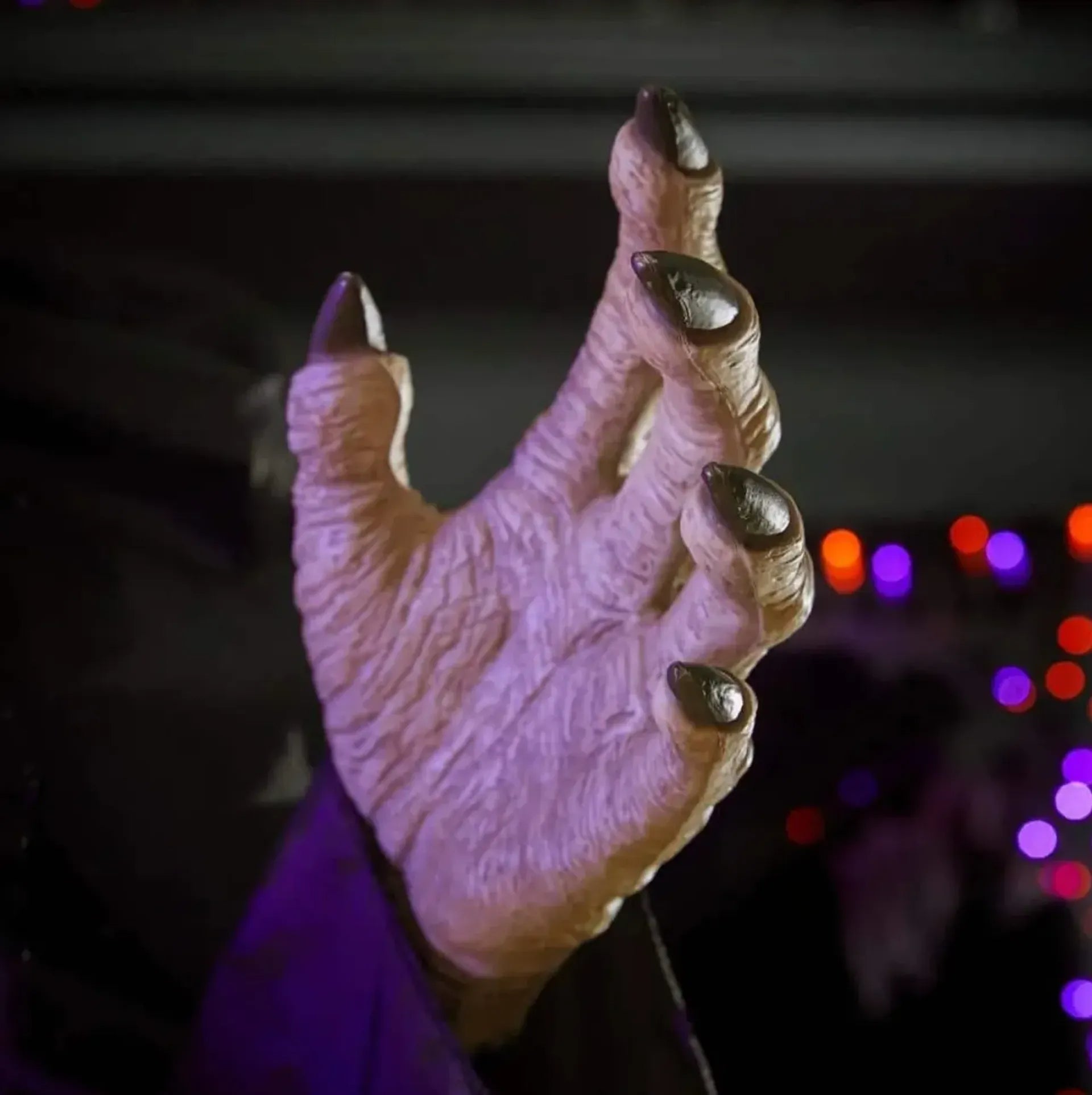 De animatronische heks, die met haar voeten zweeft, zorgt voor een griezelige sfeer tijdens de Halloweenfestiviteiten.