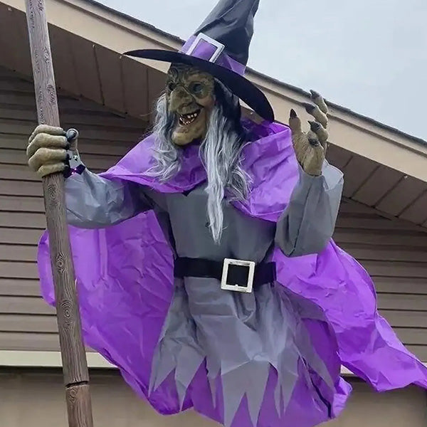 Deze animatronic vliegende heks is ontworpen voor buitengebruik en is het perfecte middelpunt voor elk Halloweenfeest.