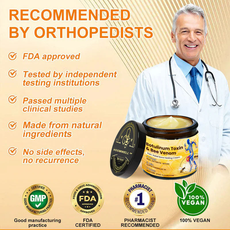 "Als orthopedisch chirurg heb ik de uitdagingen gezien waarmee patiënten met gewrichtspijn en mobiliteitsproblemen worden geconfronteerd. De formule van dit product, met name de combinatie van botulinetoxine en bijengif, toont een sterk potentieel voor het verminderen van ontstekingen, het ontspannen van spieren en het ondersteunen van gewrichtsherstel. Het sluit aan bij de therapeutische benaderingen die we gebruiken bij geavanceerde revalidatie."