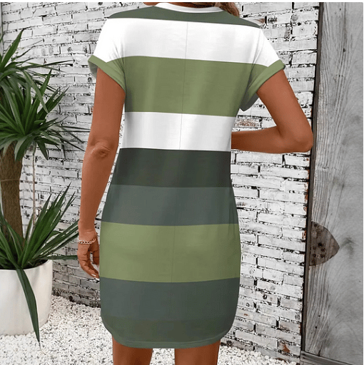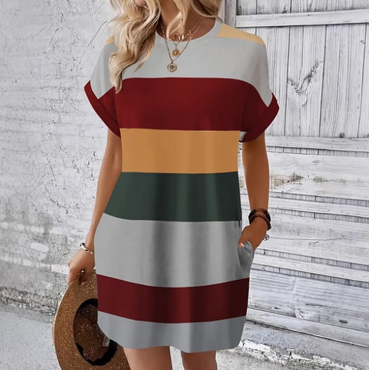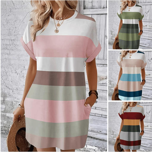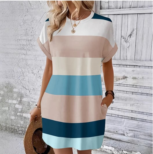 Modern kleurblokontwerp: Gedurfde, brede panelen die een modern gestreept effect creëren. Artistieke kleurblokjes voegen visueel belang toe zonder te druk te zijn, wat zich onderscheidt van typische jurken uit één stuk.