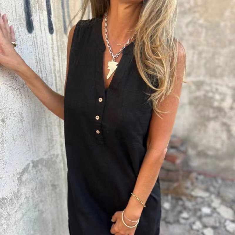 Soms heb je geen drukke prints of bonte kleuren nodig om op te vallen. Deze effen jurk bewijst dat eenvoud juist elegantie ademt. Een subtiele blikvanger, perfect voor dagen waarop jij niet hoeft te schreeuwen om gezien te worden.