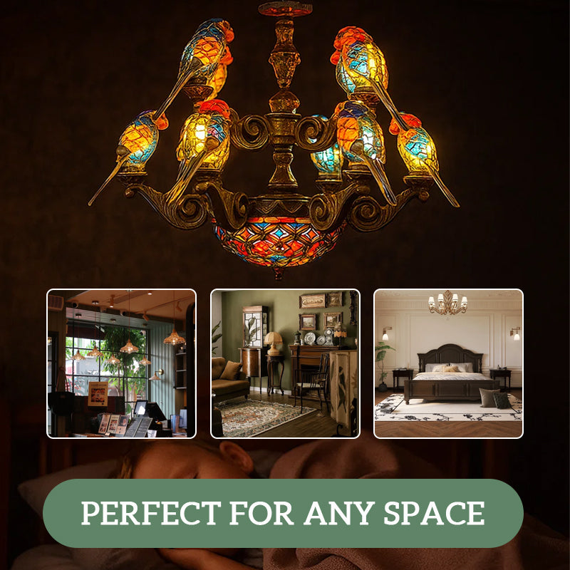 Elke vogel is gemaakt van handgesneden glas-in-lood, dat oplicht in levendige tinten die elke kamer omtoveren in een tropische droom. -