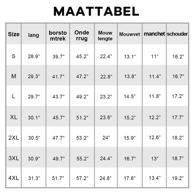Maten: S, M, L, XL, 2XL, 3XL, 4XL